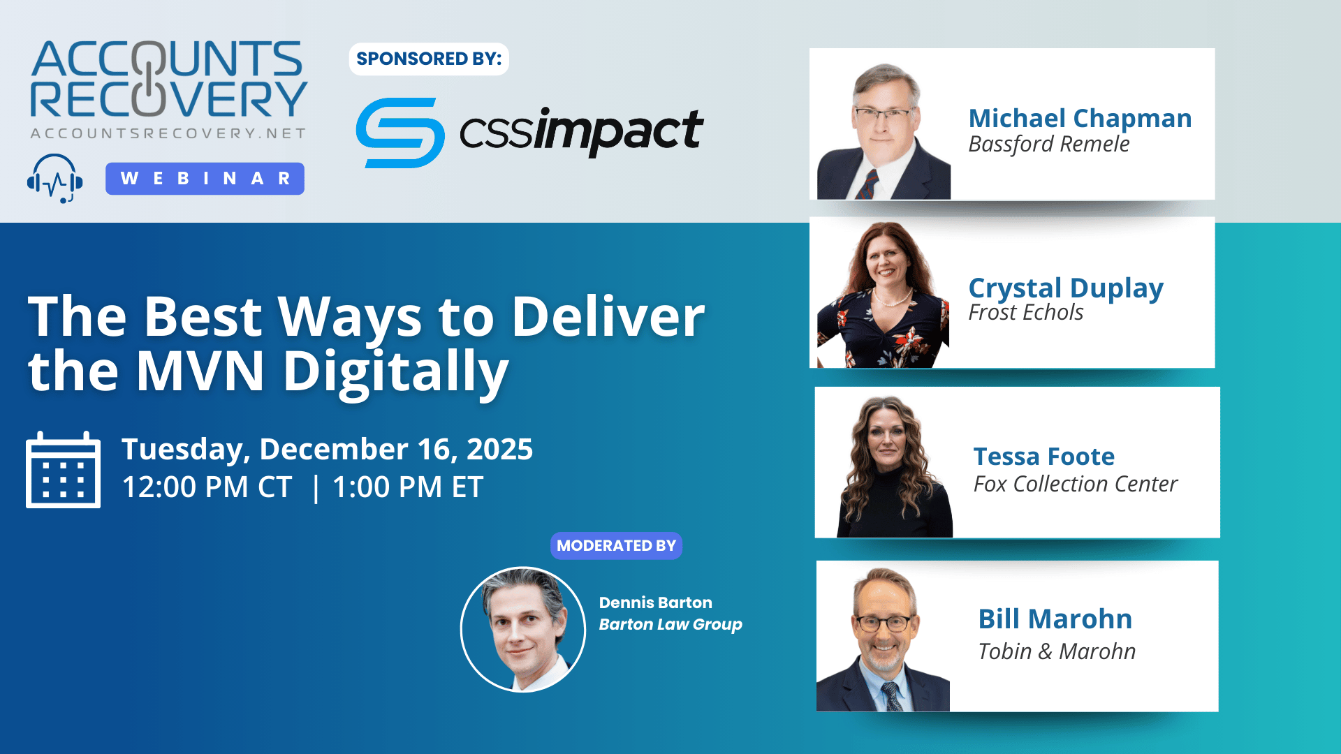 As digital communication becomes the default channel for consumer engagement, the credit and collections industry continues to grapple with how to deliver the Model Validation Notice (MVN) compliantly outside of traditional mail. In this webinar, a panel of experienced compliance and defense attorneys explored what it truly means to deliver the MVN digitallyâand where agencies, law firms, and creditors can easily create risk.