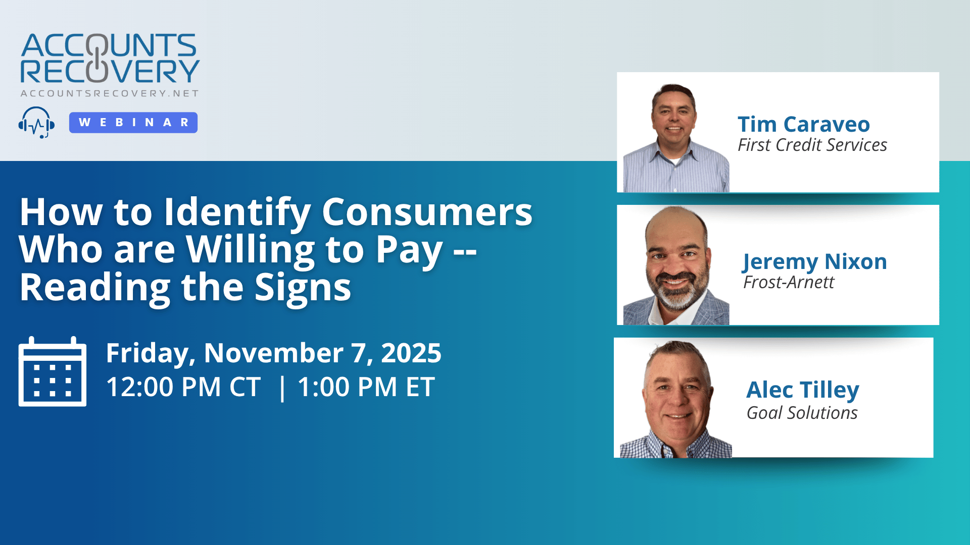 Not every consumer is the same when it comes to resolving debtâand understanding who is most likely to pay can make or break a collection strategy. In this webinar hosted by AccountsRecovery.net, industry leaders Tim Caraveo (First Credit Services), Jeremy Nixon (Frost-Arnett), and Alec Tilley (Goal Solutions) shared practical insights on how to spot âwilling payersâ early and tailor engagement strategies that drive better recovery outcomes.