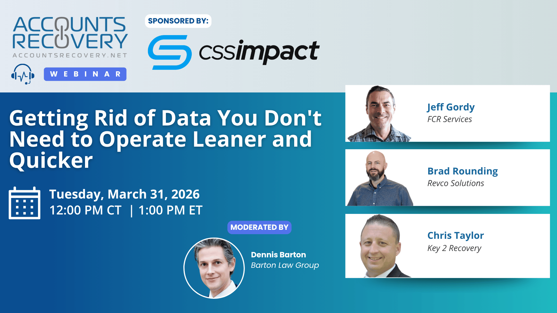 In this webinar, sponsored by CSS Impact, a panel of experts will discuss strategies for identifying redundant, outdated, or irrelevant data and how to safely eliminate it from your systems without disrupting operations or falling out of compliance.