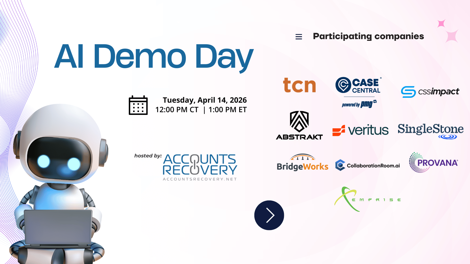 In this Demo Day, 10 companies will each demonstrate how they are embracing and harnessing the power of AI to make engaging and collecting from consumers easier and more efficient. Each company will have 10 minutes to demo their AI technology and then answer questions for five minutes.